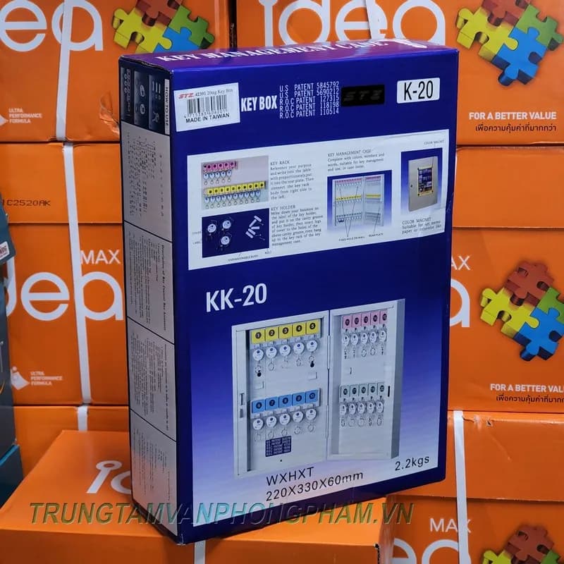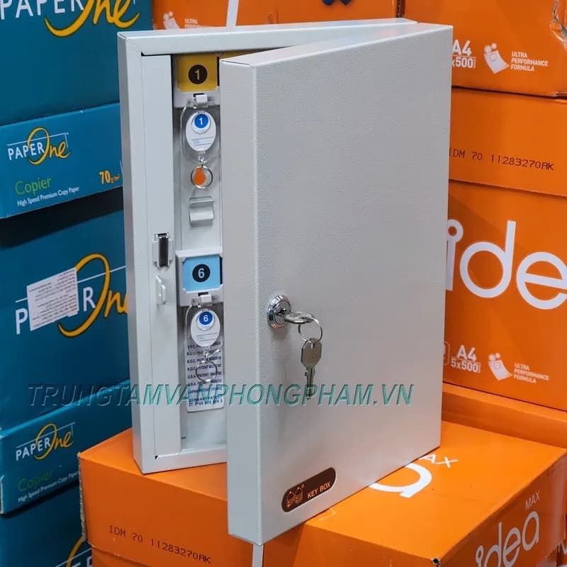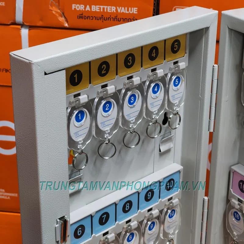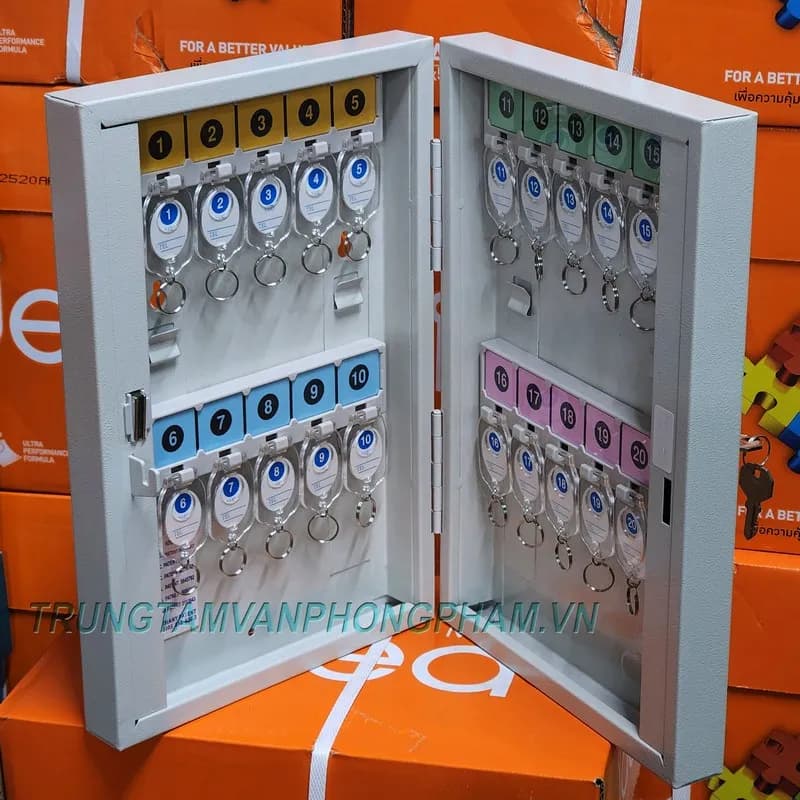 Chứa 20 móc chìa khóa được đánh số thứ tự 1-20. Tủ có kèm 20 móc cũng được đánh số có số tương ứng từ 1-20 giúp treo chìa khóa đúng vị trí trên tủ.